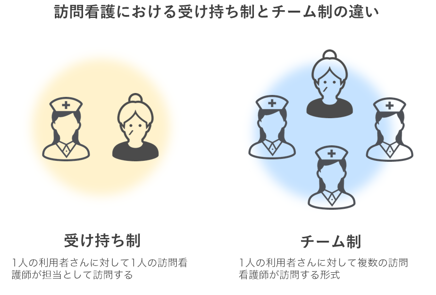 訪問看護は、訪問看護師が利用者様の療養先に伺い、看護や療養上の支援等を行いますが、体制については「受け持ち制(担当制)」「チーム制」の2つに大きく分類されます。